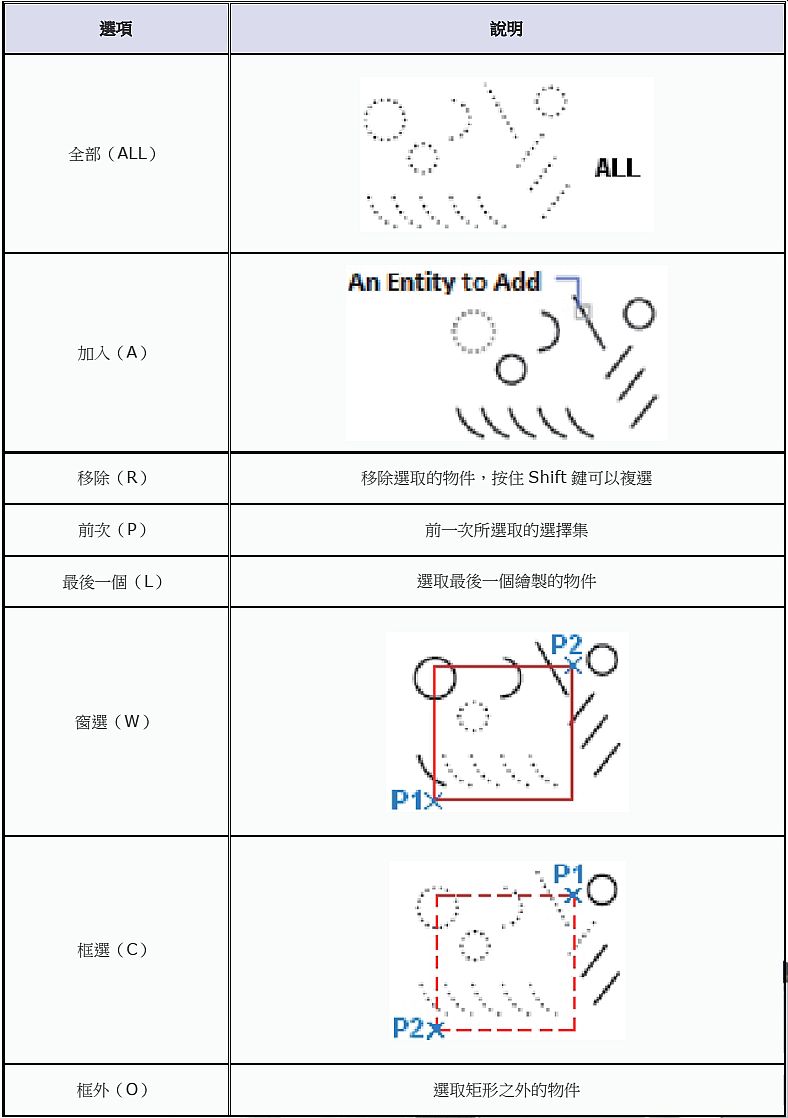 全部(ALL)/加入(A)/移除(R)/前次(P)/最後一個(L)/窗選(W)
