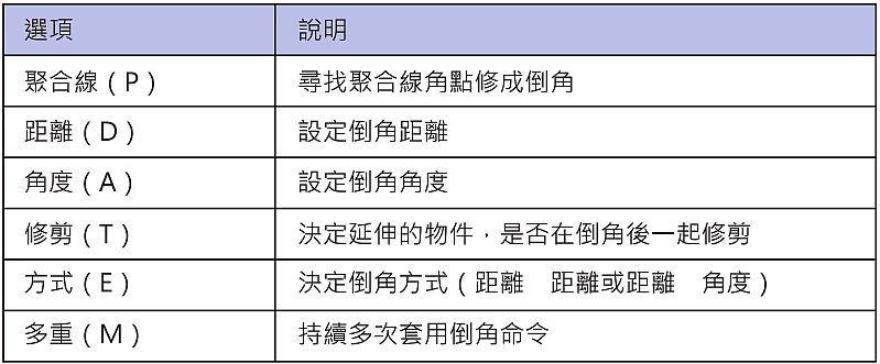 倒角(CHAMFER)命令主要用於切除物件的邊角。您可以設定切除距離與角度的方式作倒角。