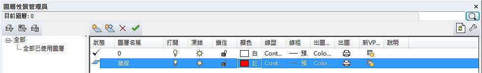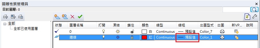 一般而言,目前使用的符號已經在圖層[牆線],圖層[0]會是預設目前使用的圖層,請參考圖層[0]目前使用的符號