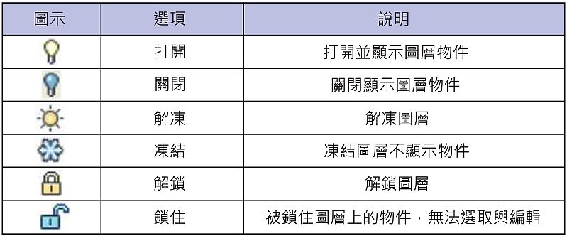 圖層是CAD非常中要的工具,您可以利用圖層設定顏色,線型,線粗等,使用圖層(LAYER)命令新增或移除圖層,以及開啟或關閉圖層的屬性,如:冷凍/解凍,鎖住/解鎖,出圖型式等。