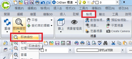 - 功能區面板 : [檢視]→[導覽]→[即時縮放]