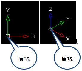 UCS圖示顯示繪圖區3D空間及原點(0,0,0),原點是固定不會改變的點。