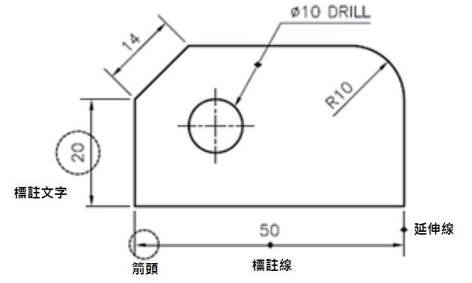 標註(Dimension)用來標示及說明圖面物件,如尺寸及註解。