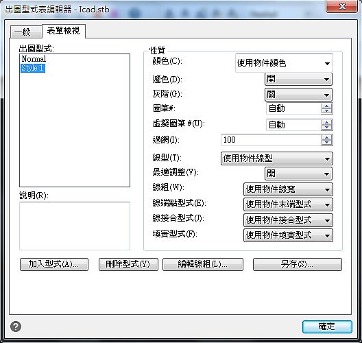 進入[出圖型式管理員]視窗後,選取一個出圖型式表(icad.stb),並按下[修改]。