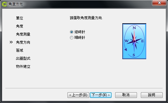 在角度方向設定中,選擇 [逆時針] 後,按下一步。