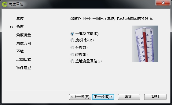 在角度設定中,選擇 [十進位] 後,按 [下一步]。