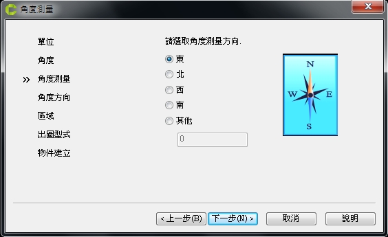 在角度測量設定中,方向選擇 [東方] 後,按下一步。