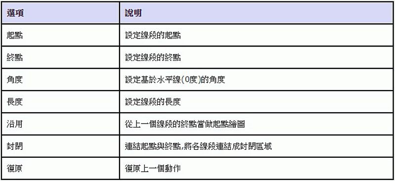 - 使用絕對座標或相對座標,輸入端點座標值